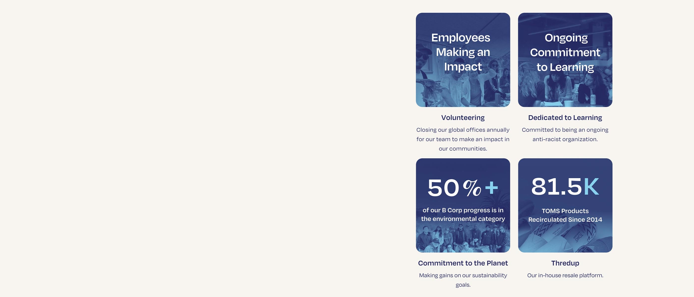 In 2024, TOMS US headquarters received their highest B Corp™ score yet - 31% higher than our first score - showcasing our dedication to progress, especially in our environmental efforts and impact on the community.