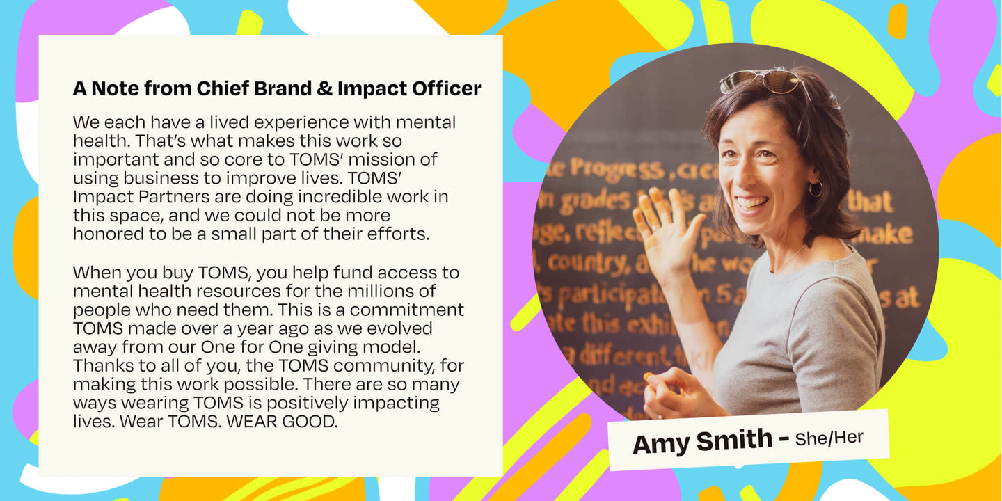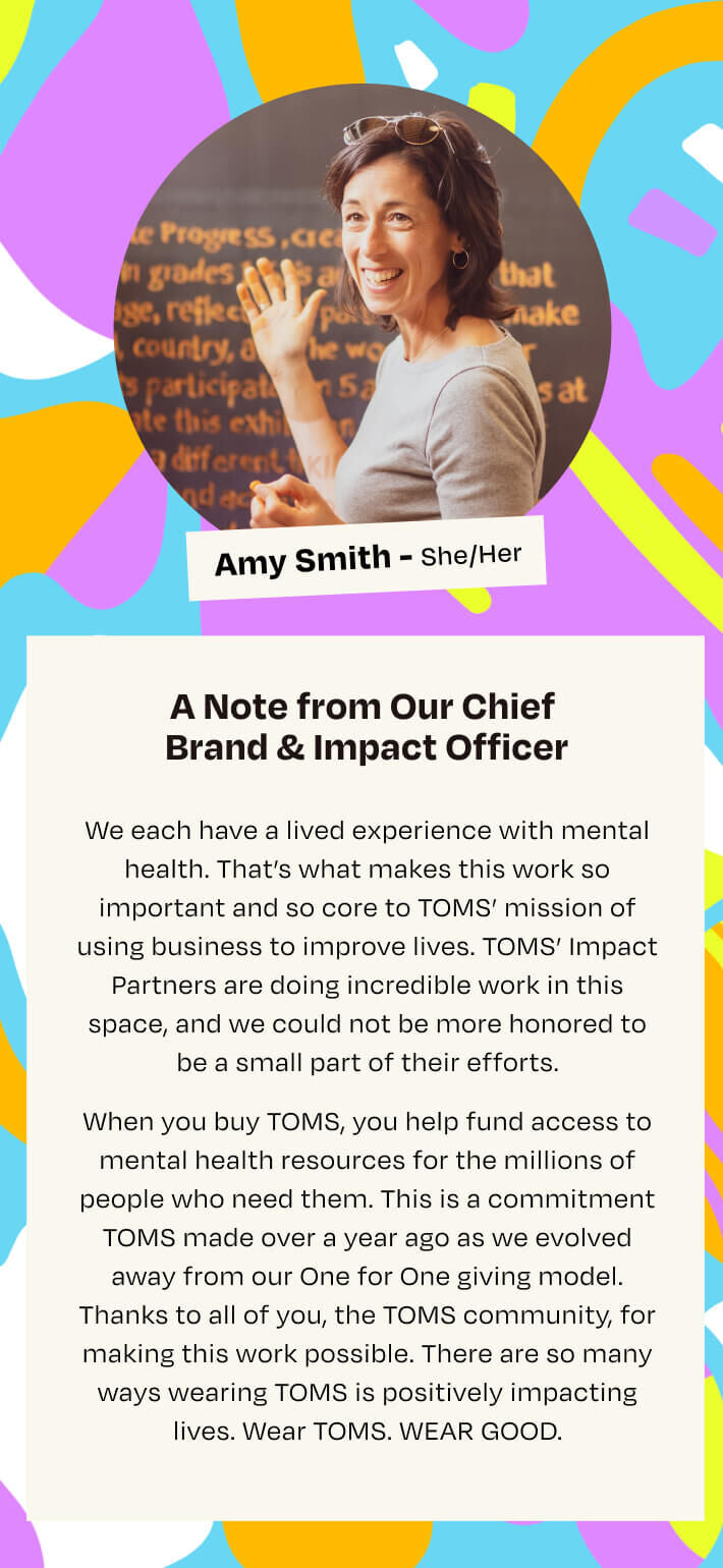 We all make choices about what we wear. We wear our style. We wear our individuality. We wear our values. At TOMS, we are proud to wear our impact on our feet. When you buy TOMS, you help fund access to mental health resources for the millions of people who need them. We do this by giving ⅓ of profits for grassroots good, which includes investing in our impact partners who are building equity at the local level. Wear TOMS. WEAR GOOD.