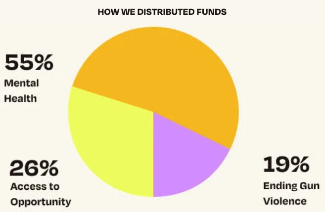 We give 1/3 of our profits for grassroots good through cash grants and building deep partnerships with nonprofits working to create impact in three areas: mental health, access to opportunity, and ending gun violence.