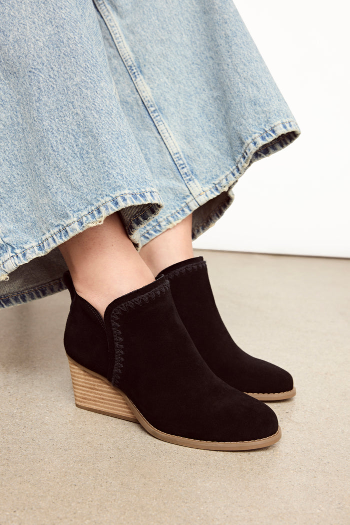 Elevate your look with the Kaia ankle boot. Featuring a wedge heel and standout silhouette for a fun, modern twist. The black suede leather uppers pair perfectly with dresses and jeans, while CloudBound™ insoles ensure lasting comfort and support.