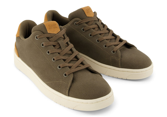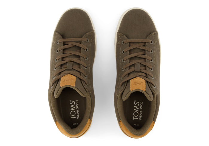 Hit the town in a new lace-up sneaker, made with TOMS TRVL LITE technology for durability and lightweight comfort. Canteen-green uppers with a contrasting tan heel cap and slightly elevated white sole complete the casual look.