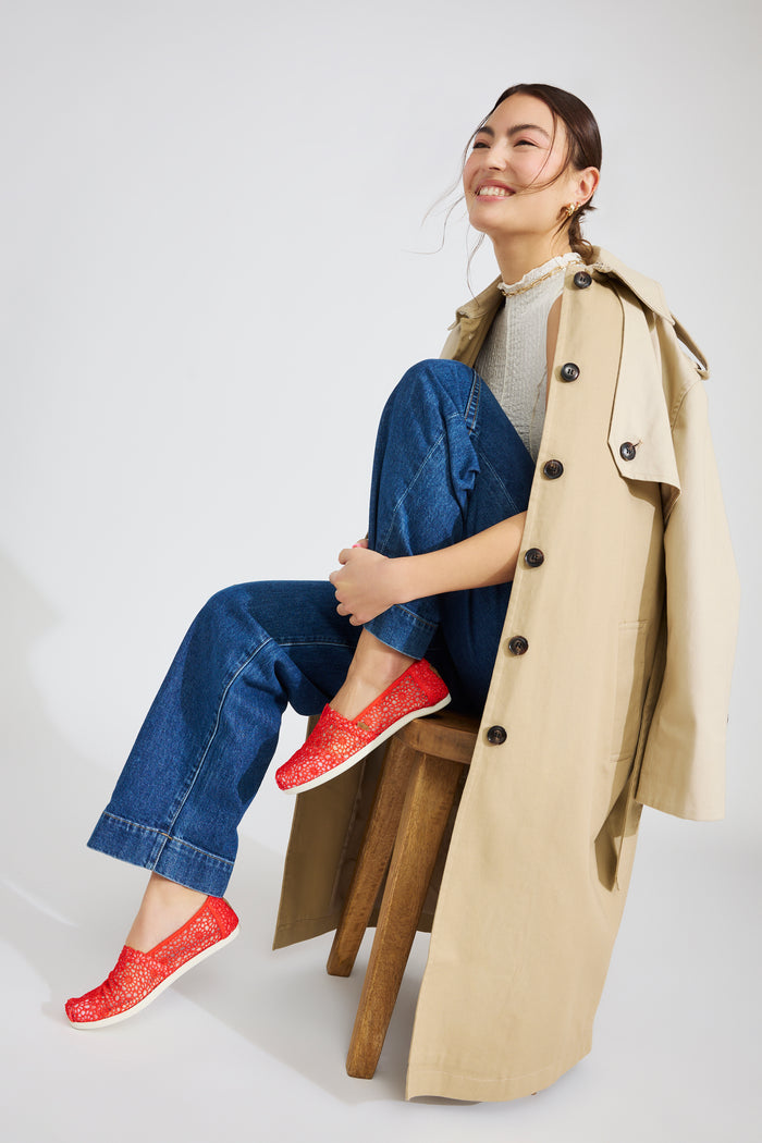 The Alpargata Classic in Flame Red: Visually stunning and made to pop. These slip-on shoes balance style and function seamlessly with brightly coloured Moroccan crochet uppers plus CloudBound™ insoles for superior comfort and support.
